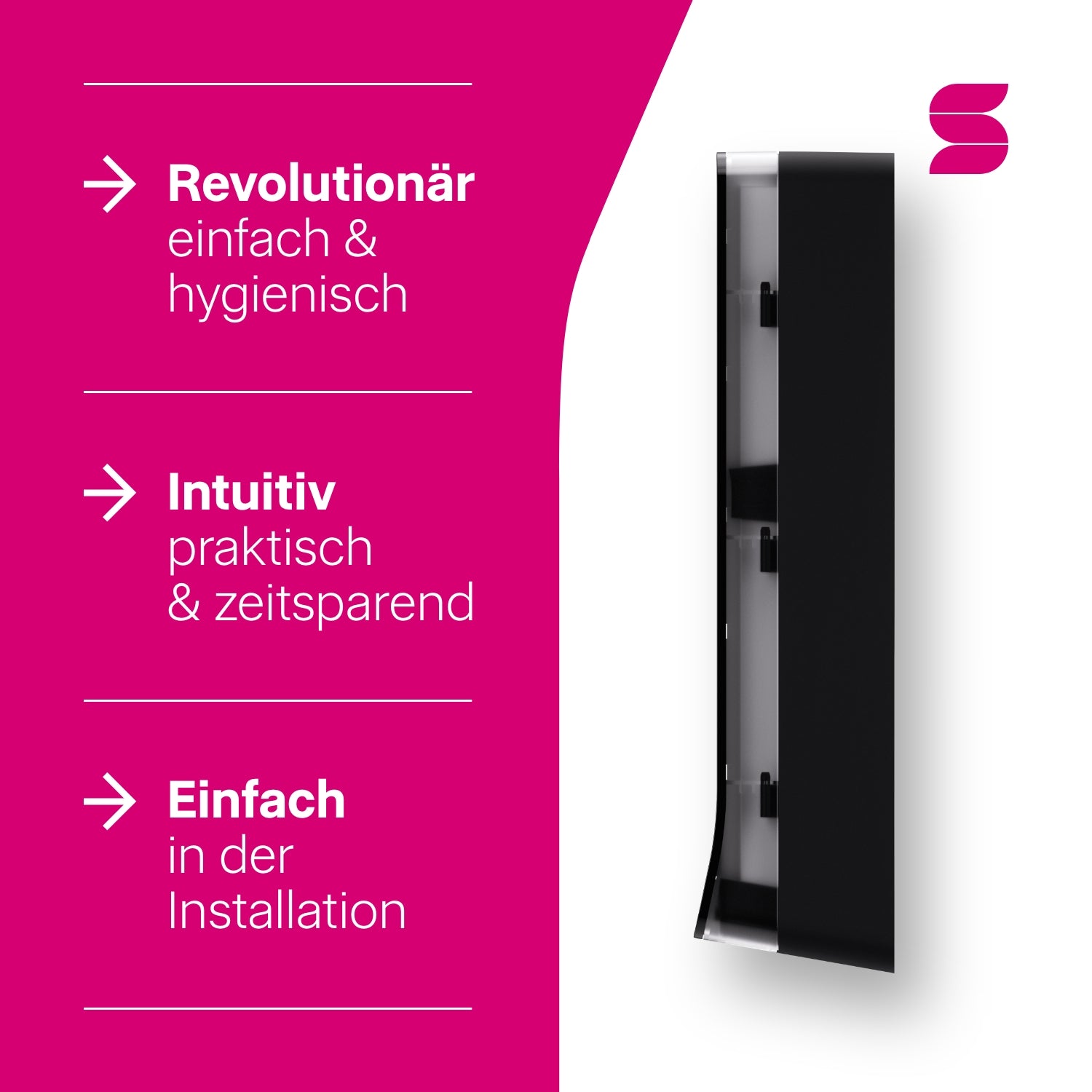 - Frontalöffnung nach oben bzw. unten – für die Montage in Waschraum-Ecken und eine schnelle Befüllung