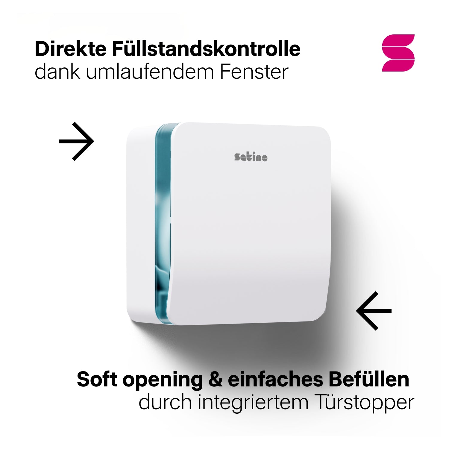 - Soft Opening Frontalöffnung nach oben oder unten – für die Montage in Waschraum-Ecken und eine schnelle Befüllung
